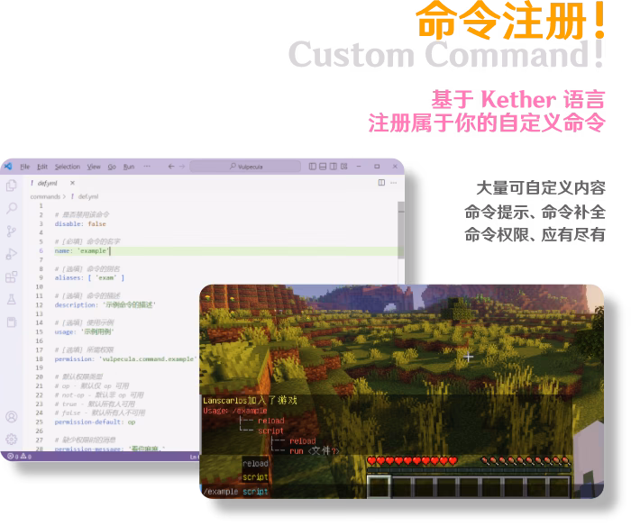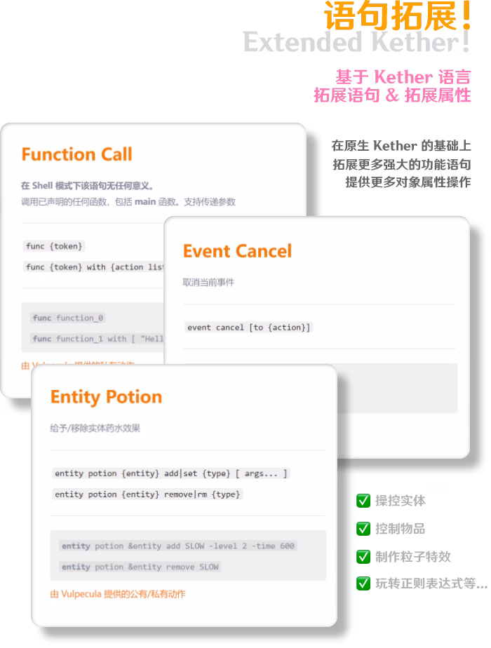 建设阶段维护脚本语言KetherVulpecula本页总览Vulpecula 链接 信息MineBBS https://www.minebbs.com/resources/.9584GitHub https://github.com/Lanscarlos/Vulpecula文档 (中文) https://www.yuque.com/lanscarlos/vulpecula-doc Bstats