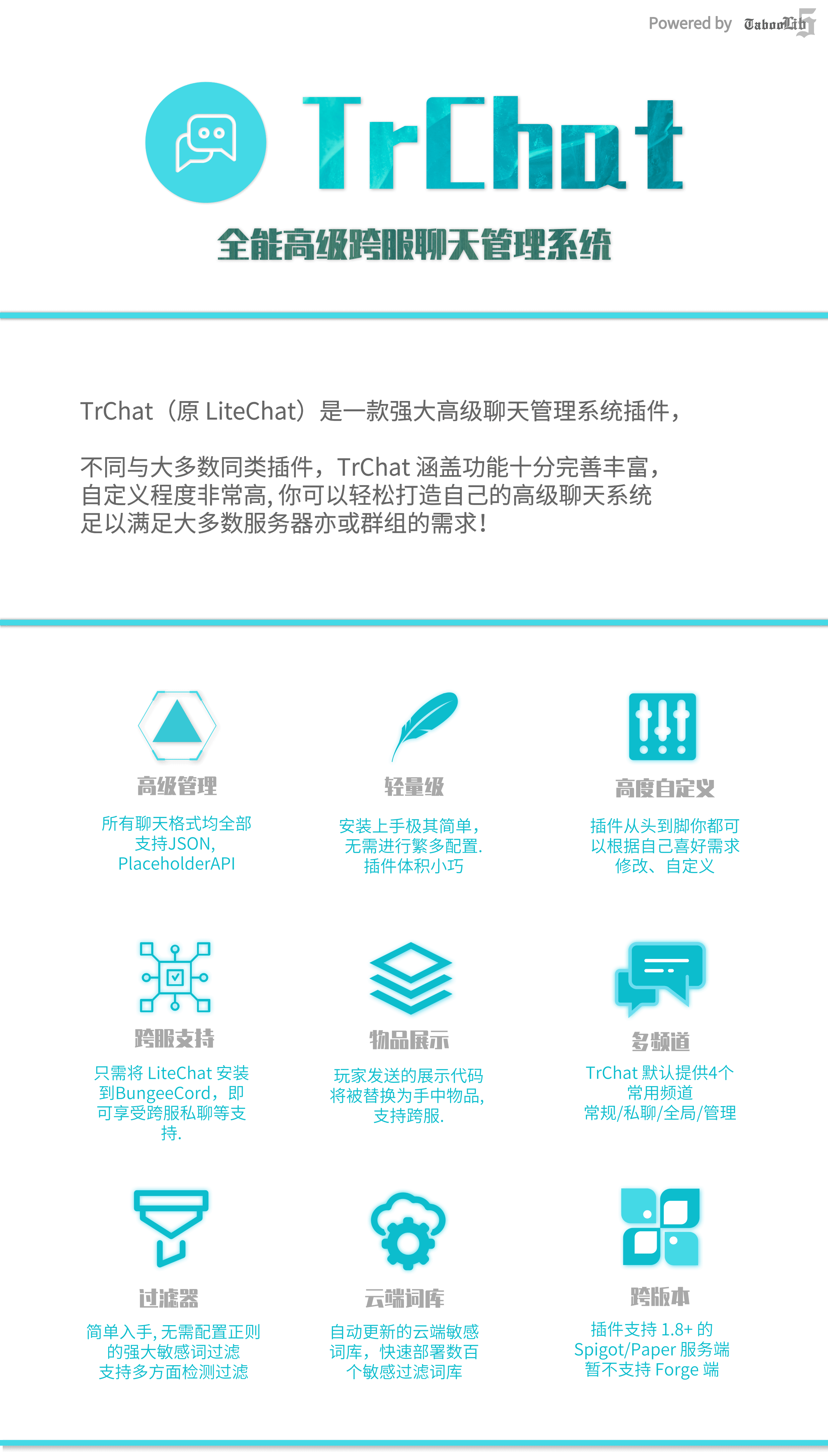 TrChat 是基于 TabooLib 开发,发布于 2019-8-16 的高级聊天系统插件